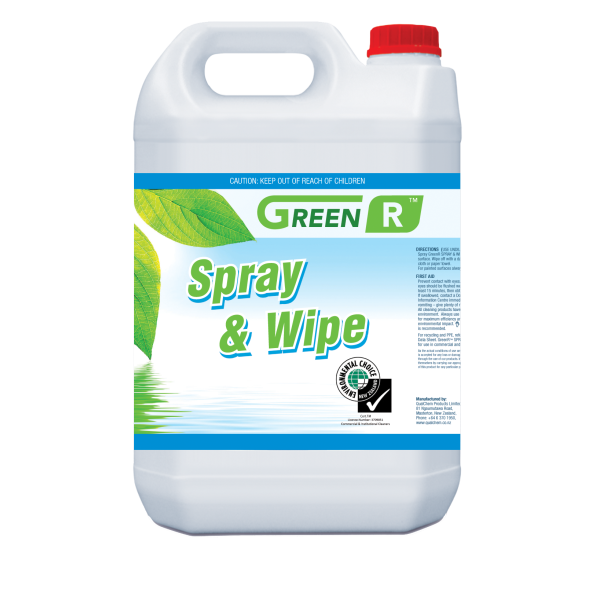 GREEN'R SPRAY & WIPE 5L is a clear blue, all-purpose spray and wipe with a pleasant fragrance. Effective for removing oil, grease, fat, rust stains, carbon and dirt from most surfaces. Biodegradable. Ready to use. Environmental Choice NZ licensed. APPLICATIONS GREEN'R SPRAY & WIPE can be used on any washable surfaces - walls, tables, benches, work surfaces, etc.