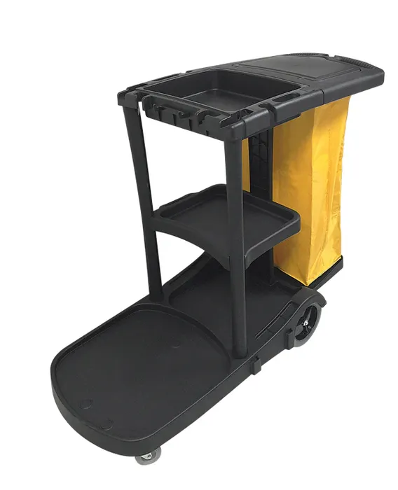 This Filta Utility Cart is ideal for storing and transporting all your cleaning products and equipment. It is lightweight and features wheels for easy mobility and a waste bag that can be used for laundry or rubbish, making it ideal for janitorial use or for use in hotels. It has shelves to provide ample storage for cleaning chemicals, detergents and utensils. It is ideal for use in schools, hotels, offices, or by cleaning professionals. A black utility trolley that is ideal for schools, offices and hotels Features wheels for easy mobility Shelves provide ample storage space for chemicals, utensils, equipment and detergents Built-in waste bag for laundry or rubbish Overall Dimensions: 510 x 1200 x 980mm (wxdxh)