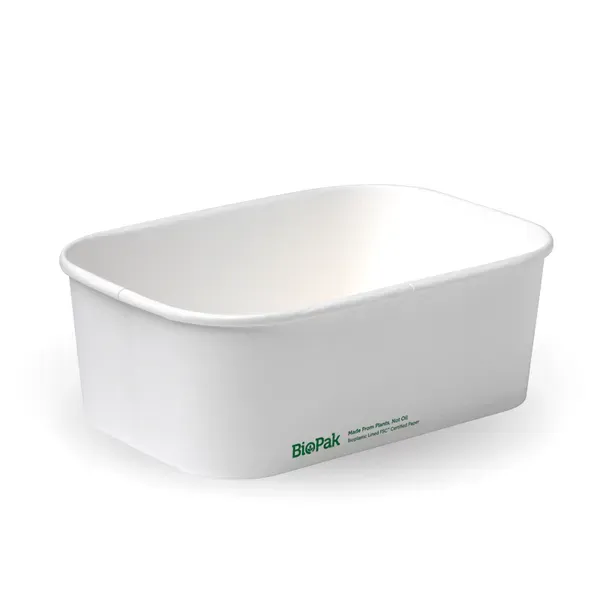 750ml BioBoard Rectangular Paper Containers are made from premium paperboard, and coated with a unique waterbased dispersion to ensure that it is waterproof and greaseproof. Perfect for hot and greasy food. Certified Compostable. These takeaway food paper containers are made from sustainably sourced FSCâ„¢ certified paper. Our rectangular food boxes have a unique waterbased, waterproof aqueous coating. They are pending certification to AS5810 Australian Standards and NF T51-800 European Standards. These takeaway boxes are perfect for hot and greasy food, such as curries and laksa. Our paper rectangular lids are suitable for contents up to 60 degrees. For anything hotter, please use CPLA or PP lids. BB-LB-750-W Sleeves per carton: 6 Units per sleeve: 50