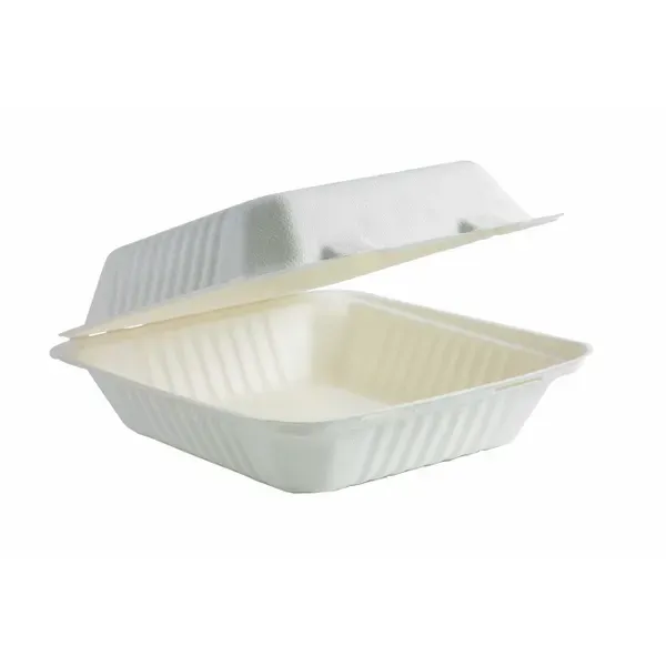 Our plastic-free clamshells are made from rapidly renewable sugarcane pulp, a by-product of the sugar refining industry. Our 7.8x8x3" white bagasse clamshell containers are an eco-friendly alternative to plastic takeaway containers. Our plant fibre clamshells are made from reclaimed and rapidly renewable sugarcane pulp – a waste by-product of the sugar refining industry that would otherwise be burned. These clamshell containers are an eco-friendly alternative to styrofoam clamshells. Our sugarcane burger boxes are an eco-friendly alternative to plastic takeaway containers and are available in white and natural colours. The bagasse clamshell containers range consists of a variety of sizes with a mixture of single, two and three compartments for many meal types B-DHL-81 Sleeves per carton: 2 Units per sleeve: 100