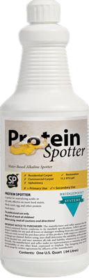 Protein Spotter is an alkaline stain remover specially formulated to remove protein stains that other spotters struggle with. Special ingredients break down proteins in blood, eggs, milk, chocolate, baby formula, cheese sauce, cream, pudding, vomit, ice cream, baby food and other protein stains so they can be easily rinsed away. Ideal for many stains found in homes, healthcare facilities, nursing homes, schools and more. Also effective on a wide variety of common, water-based stains.Dilution Ratios: RTU RTU pH: 10.5 Contains: 1 quart