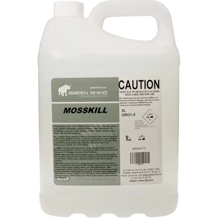 A fast-acting mould, moss & mildew remover. Ideal on concrete, pavers, roofs, gutters, fibreglass, outdoor furniture, walls and fences. No scrubbing or pressure water blasting needed just simply “spray on and leave”. Repeat application if necessary. Do not use on fabrics. BENEFITS • Highly effective on moulds, moss, mildew, lichen, black fungi and algae • Versatile, can be used on different surfaces • Easy to use, just spray it on and leave, no rinsing and scrubbing required • Proudly made in New Zealand IDEAL FOR • For outdoor use • For use with a bottle sprayer or a garden sprayer • Concrete, pavers, roofs, gutters, fibreglass, outdoor furniture, walls and fences • Roof tiles, bricks • Building exteriors, swimming pool surrounding areas, driveways, and pathways • Not be used on plastic surfaces and fabrics INDUSTRY • Hospitality - hotels, motels, holiday parks, resorts • Education - daycare / childcare centres, schools, colleges and universities • Health - hospitals, resthomes / aged care • General workplaces - offices, warehouses, retail, showrooms, manufacturing plants / factories HOW TO USE Use undiluted. Spray on to the surface to be cleaned. Wait until the mould or mildew stains disappear or soften then rinse or sponge thoroughly. Repeat if necessary. Heavy mould may require two applications. This product may not be able to remove hard water deposits. Always test first on an inconspicuous area for any colour fading. This product is classified as Dangerous Goods for transportation in New Zealand and will incur an additional fee, additional documentation from our part and extra days to deliver.