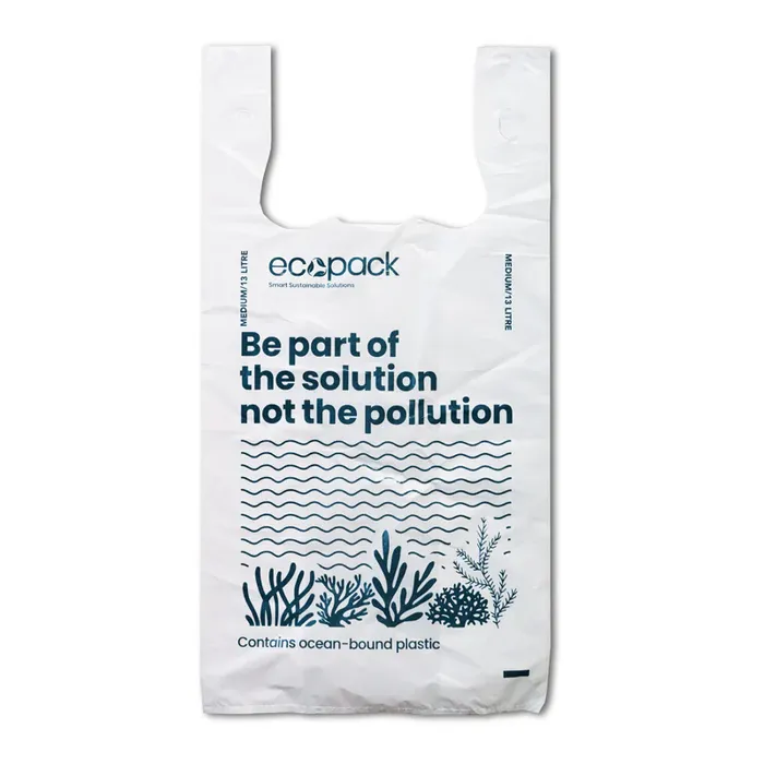 Ecopack Medium Recycled Plastic Bags are strong, eco-friendly, and cost-effective—ideal for commercial use. Made with 20% recycled ocean-bound plastic and 30% recycled plastic waste, these white bags with handles provide a practical and sustainable solution. Size: 420mm w x 385mm h + 140mm (Tie Handle) Packs per carton: 5 (100 bags per pack) Bags per carton: 500 Important: These bin liners are designed for commercial use only and cannot be sold in retail stores due to government regulations banning single-use plastic bags.