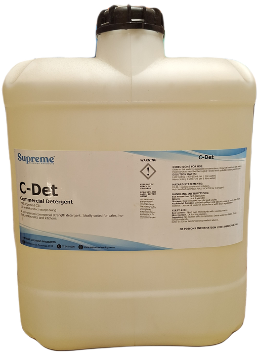C-DET Commercial Detergent is a non-scented commercial strength detergent. Mild on hands, but extra strength for general cleaning. Ideally suited for hotels, motel units, coffee lounges, restaurants & kitchens.