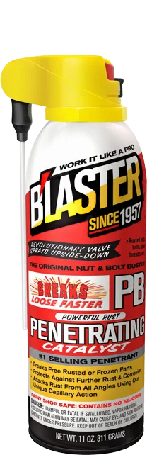 The #1-selling penetrant since 1957, PB B'laster quickly busts loose rusted or frozen parts caused by rust and corrosion. It also contains a non-evaporating lubricant that saves time and equipment and protects against further rust and corrosion. Features #1-Selling Penetrant Breaks Free Rusted or Frozen Parts Protects Against Further Rust and Corrosion Use on Automotive, Industrial, Marine, Plumbing & Other Equipment New ProStraw® with Control Flow Technology® (part# 16-PB-DS) B'LAST ON: Nuts & Bolts Corroded Pipe Threads Anything Rusted, Corroded, Stuck or Frozen