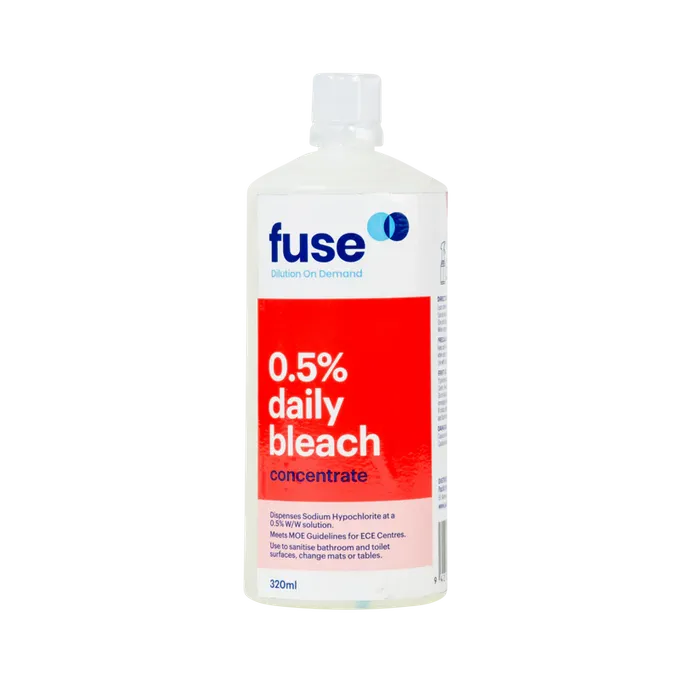Upgrade your cleaning routine with Fuse 0.5% Daily Bleach Concentrate in a convenient cartridge. Ideal for both domestic and commercial use, it serves as a potent cleaner and chlorine sanitiser, meeting MOE Guidelines for ECE Centres. Use it seamlessly with the Fuse Dilution Trigger and Water Bottle for efficient application. One cartridge saves over 5 bottles from landfill, producing 2.6L of usable product. Elevate your cleaning routine with this powerful and versatile bleach solution.