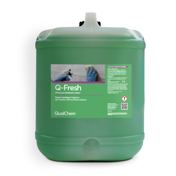 Q-FRESH 20L is a clear green perfumed mildly alkaline germicidal liquid disinfectant/detergent containing a QAC type disinfectant (Alkyl Benzyl Dimethyl Ammonium Chloride - known as benzalkonium chloride). PRODUCT FEATURES Contains an effective surface active agent which enhances the ability of the bactericide to penetrate to the bacteria. Non-volatile and stable in storage. Pleasant fragrance which leaves a lingering odour. Effective in hot and cold water. Cleans, disinfects and deodorises in one operation. A certain amount of the QAC bactericide is absorbed by the surface being cleaned, resulting in a bacteriostatic effect. APPLICATIONS Q-FRESH is an effective antibacterial cleaner deodoriser, developed for use in institutional and industrial cleaning. DILUTIONS For cleaning and deodorising all hard surfaces, use Q-FRESH diluted 1:40. Allow contact with surface for at least 5 mins before rinsing. For cleaning and disinfecting floors treated with a polymer floor dressing, use Q-FRESH diluted 1:80. For soaking soiled linen use Q-FRESH diluted 1:80 If large amounts of organic matter are present, Q-FRESH should be used more concentrated than is indicated above.